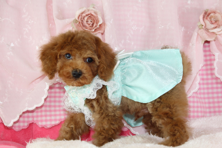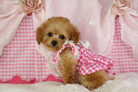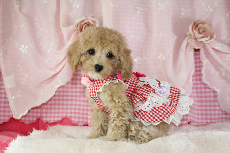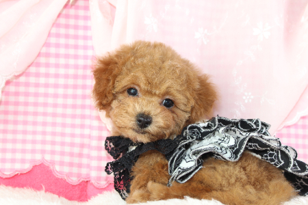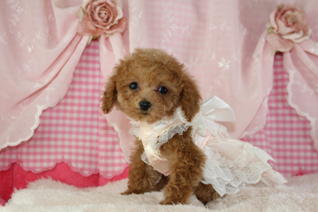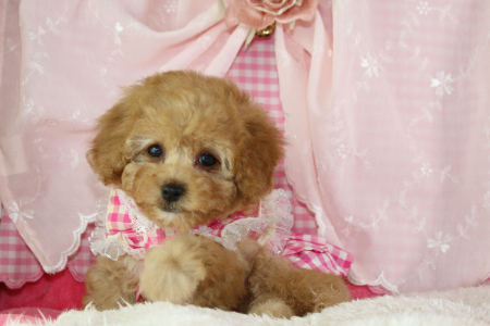 ご覧くださいましてありがとうございます。 そっと抱きしめると深~い「極上の癒し」で満たされる!そんないつも抱っこして一緒に居たいと思わずにはいられない女の子*✲゚*お姫様のご紹介です。 成犬サイズ予想 ティーカップ確定.。.:*✧ ちっちゃ~いお顔♡*゜短いお鼻♡、漆黒のまぁるいお目め♡*゜キラキラな瞳で見つめられたら即効ハート♡ズギュン!!間違い無しですね(>_<) とても人懐こく、寄り添ってくれる仕草や態度に癒されて幸せな気持ちになります!抱っこが大好きでお膝の上から離れません(笑)、、こんな子がいつも側に居てくれたなら…日々の暮らしが明るく、一変しますよね! 語りかけますと…首をかしげ、お耳を動かしながらお話を聞いてくれます!(*≧∀≦*) 身体は綺麗なアプリコットcolorのモコモコふわふわ♡小さな身体でちょこん!ちょこん!歩きます♡…可愛いオーラ♡♡♡全開の女の子です。 無駄吠えは一切ございません。初めての方でも、とても飼いやすかと思います。 トイレのトレーニングも進んでおりましてケージの中ではほとんど良くできています!偉いですよね~(^-^) ご飯は一日に朝と夜の2回のみですから、 ひとりでのお留守番も大丈夫!安心できますね。 一言でティーカッププードルと申しましてもあまりに小さ過ぎますと長生きできず2歳ぐらいで死んでしまったり、仮に長生きしたとしても病気勝ちだったり膝が悪くなってしまったりまた、皮毛が薄くなり貧相になってしまったりとトラブルが多くなることが一般的です。ですがご紹介させて頂きます仔犬は骨量もしっかりとあり内蔵系の心配もなくご飯をしっかりと食べておりますのでそんな心配はございません。 この度、少し後ろ足の膝の状態が悪い(パテラ、グレード1)という獣医師の診断を受けましたのでお値段を下げさせていただいてのご案内となりました。詳細につきましてはお問い合わせくださいませ。 健康で最高に可愛い仔犬を是非!、、、当犬舎までこの子に会いに来てくださいね。お待ちしております!(*´︶`*)ฅ