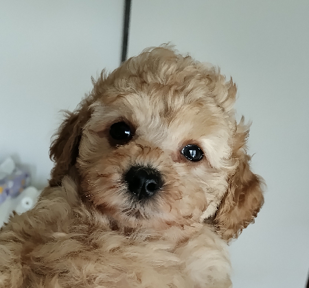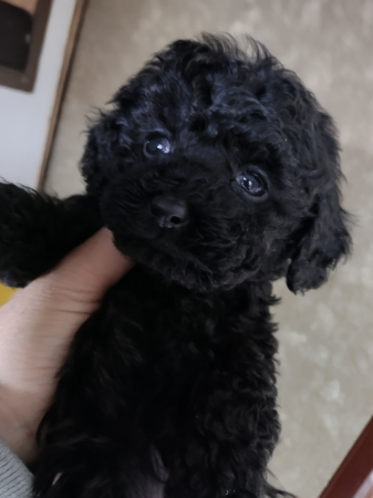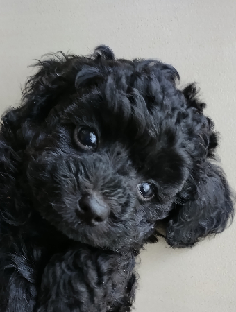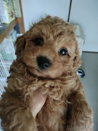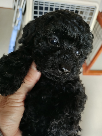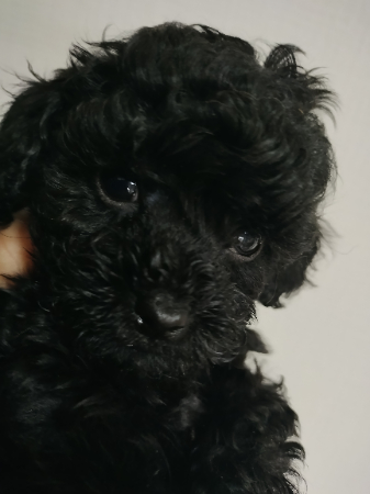 10/1生まれ、ブラックの女の子 父 アプリコット3.5kg 2歳 母 ブラウン3.2kg 2歳 トイサイズ予想 毛量多く真っ黒で巻きの強い被毛、クリクリの大きな目、短めの手足鼻、ドワーフタイプの女の子です お顔がだいぶ出来上がって来ました! 活発で好奇心旺盛、離乳ほぼ完了 ケージから出すと先住犬たちに物怖じもせず、ちょっかい出されながら走り回っています! 人間大好きで初めての人にも尻尾フリフリのキス魔、無駄吠えも無くとても飼いやすいワンちゃんです。 11/28 5種ワクチン接種・マイクロチップ挿入、健診済み。(検便・心音・膝関節・股関節・顎関節・噛合・耳ダニ全て正常)