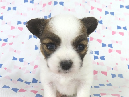 ※体重などの情報は後日掲載いたします。 12/21現在の体重は0.58kgです。 モレラがありますが消失する可能性がございます。 子犬と親犬はブリーダー歴30数年、40数年の経験者と動物看護士などが中心に365日、注意深く、丁寧に観察してお世話をしております。 子犬ちゃんは人間同様、個人差がありますので、子犬ちゃんのお世話の仕方、お食事あげ方はご見学時、お迎え時などに担当のスタッフより詳しくお伝えいたしますのでなんでもご遠慮なくご相談ください。 JKCの全犬種審査員資格者と単犬種パピヨン審査員資格者が在舎しておりますので、パピヨンのスタンダードを熟知しております。 当犬舎はパピヨン一筋50年を超える日本で一番歴史のあるパピヨン専門犬舎です。 犬舎号と登録は1970.10/19です。 日本中の国産のパピヨンで当犬舎の血統が入っていない犬は存在しません。 血統書発行団体JKCより下記表彰を受けております。 JKC特別繁殖奨励賞第1位受賞 犬舎 JKCパピヨン犬種表彰受賞 犬舎 ご見学は大歓迎ですのでどうぞご連絡の上、おいでください。365日年中無休です。 2013年9月1日より「動物の愛護と管理に関する法律」の改正によって、「生体販売時の現物確認・対面販売」が義務規定となりましたので、最低一度は直接犬舎までご来舎いただかなくてはなりません。従いまして今までのようにネットで写真、動画をご覧になっただけではご購入ができなくなりました。これはすべてのブリーダー・ペットショップも例外がありませんので、ご理解、ご協力のほど御願い申し上げます。 手続きに時間がかるため海外への輸出はいたしません。 スタッフの取得資格 (社)JKC 全犬種審査員2名(社)JKC 単犬種パピヨン審査員1名 (国) 動物看護師統一認定機構 愛玩動物看護師国家資格取得(社)JKC スチュアート1名(社)JKC A級ハンドラー1名 (社)JKC C級ハンドラー1名(社)日本愛玩動物協会 愛玩動物飼養管理士2級3名 動物の愛護及び管理に関する法律による動物取扱責任者2名