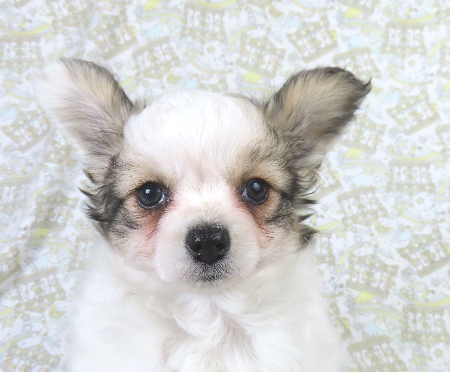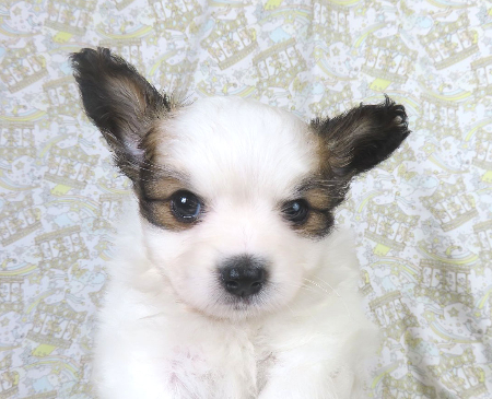 父 オルフ 母 ポロロン 11/19現在の体重は2.75kgです。 モレラがありますが成長とともに消える可能性があります。 見学当日にお迎え可能です。 混合ワクチン3回接種済み 子犬と親犬はブリーダー歴30数年、40数年の経験者と動物看護士などが中心に365日、注意深く、丁寧に観察してお世話をしております。 子犬ちゃんは人間同様、個人差がありますので、子犬ちゃんのお世話の仕方、お食事あげ方はご見学時、お迎え時などに担当のスタッフより詳しくお伝えいたしますのでなんでもご遠慮なくご相談ください。 JKCの全犬種審査員資格者と単犬種パピヨン審査員資格者が在舎しておりますので、パピヨンのスタンダードを熟知しております。 当犬舎はパピヨン一筋50年を超える日本で一番歴史のあるパピヨン専門犬舎です。 犬舎号と登録は1970.10/19です。 日本中の国産のパピヨンで当犬舎の血統が入っていない犬は存在しません。 血統書発行団体JKCより下記表彰を受けております。 JKC特別繁殖奨励賞第1位受賞 犬舎 JKCパピヨン犬種表彰受賞 犬舎 ご見学は大歓迎ですのでどうぞご連絡の上、おいでください。365日年中無休です。 2013年9月1日より「動物の愛護と管理に関する法律」の改正によって、「生体販売時の現物確認・対面販売」が義務規定となりましたので、最低一度は直接犬舎までご来舎いただかなくてはなりません。従いまして今までのようにネットで写真、動画をご覧になっただけではご購入ができなくなりました。これはすべてのブリーダー・ペットショップも例外がありませんので、ご理解、ご協力のほど御願い申し上げます。 手続きに時間がかるため海外への輸出はいたしません。 スタッフの取得資格 (社)JKC 全犬種審査員2名(社)JKC 単犬種パピヨン審査員1名 (国) 動物看護師統一認定機構 愛玩動物看護師国家資格取得(社)JKC スチュアート1名(社)JKC A級ハンドラー1名 (社)JKC C級ハンドラー1名(社)日本愛玩動物協会 愛玩動物飼養管理士2級3名 動物の愛護及び管理に関する法律による動物取扱責任者2名
