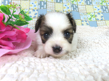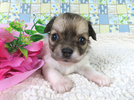 ※体重などの情報は後日掲載いたします。 モレラがありますが成長ともに塞がることがあるため特に欠点とは考えておりません。 10/7現在の体重は0.575kgです。 子犬と親犬はブリーダー歴30数年、40数年の経験者と動物看護士などが中心に365日、注意深く、丁寧に観察してお世話をしております。 子犬ちゃんは人間同様、個人差がありますので、子犬ちゃんのお世話の仕方、お食事あげ方はご見学時、お迎え時などに担当のスタッフより詳しくお伝えいたしますのでなんでもご遠慮なくご相談ください。 JKCの全犬種審査員資格者と単犬種パピヨン審査員資格者が在舎しておりますので、パピヨンのスタンダードを熟知しております。 当犬舎はパピヨン一筋50年を超える日本で一番歴史のあるパピヨン専門犬舎です。 犬舎号と登録は1970.10/19です。 日本中の国産のパピヨンで当犬舎の血統が入っていない犬は存在しません。 血統書発行団体JKCより下記表彰を受けております。 JKC特別繁殖奨励賞第1位受賞 犬舎 JKCパピヨン犬種表彰受賞 犬舎 ご見学は大歓迎ですのでどうぞご連絡の上、おいでください。365日年中無休です。 2013年9月1日より「動物の愛護と管理に関する法律」の改正によって、「生体販売時の現物確認・対面販売」が義務規定となりましたので、最低一度は直接犬舎までご来舎いただかなくてはなりません。従いまして今までのようにネットで写真、動画をご覧になっただけではご購入ができなくなりました。これはすべてのブリーダー・ペットショップも例外がありませんので、ご理解、ご協力のほど御願い申し上げます。 手続きに時間がかるため海外への輸出はいたしません。 スタッフの取得資格 (社)JKC 全犬種審査員2名(社)JKC 単犬種パピヨン審査員1名 (国) 動物看護師統一認定機構 愛玩動物看護師国家資格取得(社)JKC スチュアート1名(社)JKC A級ハンドラー1名 (社)JKC C級ハンドラー1名(社)日本愛玩動物協会 愛玩動物飼養管理士2級3名 動物の愛護及び管理に関する法律による動物取扱責任者2名