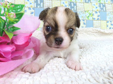 ※体重などの情報は後日掲載いたします。 モレラがありますが成長ともに塞がることがあるため特に欠点とは考えておりません。 10/7現在の体重は0.615kgです。 子犬と親犬はブリーダー歴30数年、40数年の経験者と動物看護士などが中心に365日、注意深く、丁寧に観察してお世話をしております。 子犬ちゃんは人間同様、個人差がありますので、子犬ちゃんのお世話の仕方、お食事あげ方はご見学時、お迎え時などに担当のスタッフより詳しくお伝えいたしますのでなんでもご遠慮なくご相談ください。 JKCの全犬種審査員資格者と単犬種パピヨン審査員資格者が在舎しておりますので、パピヨンのスタンダードを熟知しております。 当犬舎はパピヨン一筋50年を超える日本で一番歴史のあるパピヨン専門犬舎です。 犬舎号と登録は1970.10/19です。 日本中の国産のパピヨンで当犬舎の血統が入っていない犬は存在しません。 血統書発行団体JKCより下記表彰を受けております。 JKC特別繁殖奨励賞第1位受賞 犬舎 JKCパピヨン犬種表彰受賞 犬舎 ご見学は大歓迎ですのでどうぞご連絡の上、おいでください。365日年中無休です。 2013年9月1日より「動物の愛護と管理に関する法律」の改正によって、「生体販売時の現物確認・対面販売」が義務規定となりましたので、最低一度は直接犬舎までご来舎いただかなくてはなりません。従いまして今までのようにネットで写真、動画をご覧になっただけではご購入ができなくなりました。これはすべてのブリーダー・ペットショップも例外がありませんので、ご理解、ご協力のほど御願い申し上げます。 手続きに時間がかるため海外への輸出はいたしません。 スタッフの取得資格 (社)JKC 全犬種審査員2名(社)JKC 単犬種パピヨン審査員1名 (国) 動物看護師統一認定機構 愛玩動物看護師国家資格取得(社)JKC スチュアート1名(社)JKC A級ハンドラー1名 (社)JKC C級ハンドラー1名(社)日本愛玩動物協会 愛玩動物飼養管理士2級3名 動物の愛護及び管理に関する法律による動物取扱責任者2名