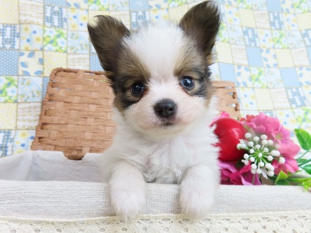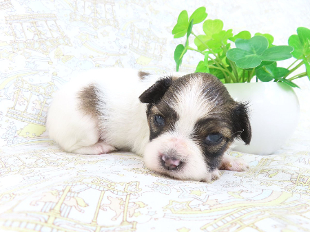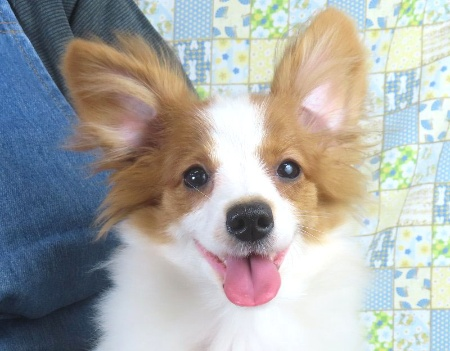 父 吉五郎 イギリスチャンピオンアークの血統 母 ひなの インターナショナルチャンピオンゴールデンウィッシュリングランドの血統 イギリス×イギリスのアウトラインブリードです。 現在モレラがありますが小さいタイプなので、特に問題とは思っておりません。 成長時の予想体重は2.5~3.5キロ 11/11現在の体重は0.85kgです。 子犬と親犬はブリーダー歴30数年、40数年の経験者と動物看護士などが中心に365日、注意深く、丁寧に観察してお世話をしております。 子犬ちゃんは人間同様、個人差がありますので、子犬ちゃんのお世話の仕方、お食事あげ方はご見学時、お迎え時などに担当のスタッフより詳しくお伝えいたしますのでなんでもご遠慮なくご相談ください。 JKCの全犬種審査員資格者と単犬種パピヨン審査員資格者が在舎しておりますので、パピヨンのスタンダードを熟知しております。 当犬舎はパピヨン一筋50年を超える日本で一番歴史のあるパピヨン専門犬舎です。 犬舎号と登録は1970.10/19です。 日本中の国産のパピヨンで当犬舎の血統が入っていない犬は存在しません。 血統書発行団体JKCより下記表彰を受けております。 JKC特別繁殖奨励賞第1位受賞 犬舎 JKCパピヨン犬種表彰受賞 犬舎 ご見学は大歓迎ですのでどうぞご連絡の上、おいでください。365日年中無休です。 2013年9月1日より「動物の愛護と管理に関する法律」の改正によって、「生体販売時の現物確認・対面販売」が義務規定となりましたので、最低一度は直接犬舎までご来舎いただかなくてはなりません。従いまして今までのようにネットで写真、動画をご覧になっただけではご購入ができなくなりました。これはすべてのブリーダー・ペットショップも例外がありませんので、ご理解、ご協力のほど御願い申し上げます。 手続きに時間がかるため海外への輸出はいたしません。 スタッフの取得資格 (社)JKC 全犬種審査員2名(社)JKC 単犬種パピヨン審査員1名 (国) 動物看護師統一認定機構 愛玩動物看護師国家資格取得(社)JKC スチュアート1名(社)JKC A級ハンドラー1名 (社)JKC C級ハンドラー1名(社)日本愛玩動物協会 愛玩動物飼養管理士2級3名 動物の愛護及び管理に関する法律による動物取扱責任者2名