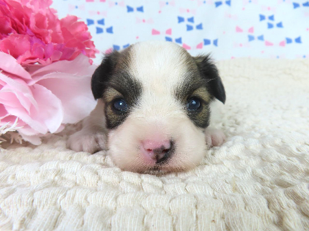 ※体重などの情報は後日掲載いたします。 10/14現在の体重は0.685kgです。 子犬と親犬はブリーダー歴30数年、40数年の経験者と動物看護士などが中心に365日、注意深く、丁寧に観察してお世話をしております。 子犬ちゃんは人間同様、個人差がありますので、子犬ちゃんのお世話の仕方、お食事あげ方はご見学時、お迎え時などに担当のスタッフより詳しくお伝えいたしますのでなんでもご遠慮なくご相談ください。 JKCの全犬種審査員資格者と単犬種パピヨン審査員資格者が在舎しておりますので、パピヨンのスタンダードを熟知しております。 当犬舎はパピヨン一筋50年を超える日本で一番歴史のあるパピヨン専門犬舎です。 犬舎号と登録は1970.10/19です。 日本中の国産のパピヨンで当犬舎の血統が入っていない犬は存在しません。 血統書発行団体JKCより下記表彰を受けております。 JKC特別繁殖奨励賞第1位受賞 犬舎 JKCパピヨン犬種表彰受賞 犬舎 ご見学は大歓迎ですのでどうぞご連絡の上、おいでください。365日年中無休です。 2013年9月1日より「動物の愛護と管理に関する法律」の改正によって、「生体販売時の現物確認・対面販売」が義務規定となりましたので、最低一度は直接犬舎までご来舎いただかなくてはなりません。従いまして今までのようにネットで写真、動画をご覧になっただけではご購入ができなくなりました。これはすべてのブリーダー・ペットショップも例外がありませんので、ご理解、ご協力のほど御願い申し上げます。 手続きに時間がかるため海外への輸出はいたしません。 スタッフの取得資格 (社)JKC 全犬種審査員2名(社)JKC 単犬種パピヨン審査員1名 (国) 動物看護師統一認定機構 愛玩動物看護師国家資格取得(社)JKC スチュアート1名(社)JKC A級ハンドラー1名 (社)JKC C級ハンドラー1名(社)日本愛玩動物協会 愛玩動物飼養管理士2級3名 動物の愛護及び管理に関する法律による動物取扱責任者2名
