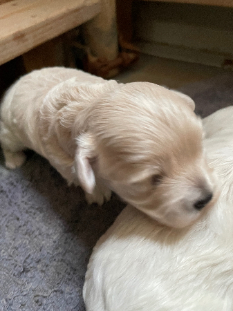 父親マルチーズ(ホワイト)と母親トイプードル(レッド)のミックスでマルチーズの愛らしく甘えん坊な可愛さとトイプードルの賢こく抜け毛が少ない飼いやすさを伴うマルプーは一度飼うとその虜です😌一度会ってみて下さい。その良さが伝わるはず😃