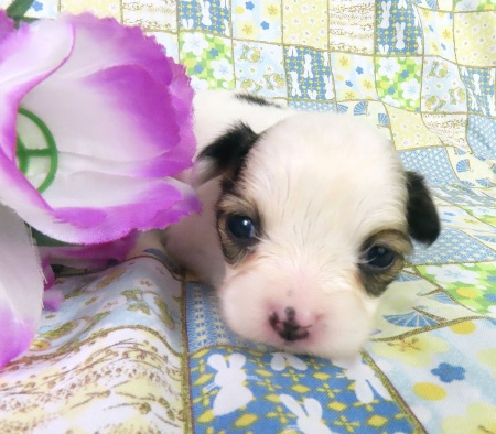 ※体重などの情報は後日掲載いたします。 2/11現在の体重は0.485kgです。 4/2~お迎え可能です。 子犬と親犬はブリーダー歴30数年、40数年の経験者と動物看護士などが中心に365日、注意深く、丁寧に観察してお世話をしております。 子犬ちゃんは人間同様、個人差がありますので、子犬ちゃんのお世話の仕方、お食事あげ方はご見学時、お迎え時などに担当のスタッフより詳しくお伝えいたしますのでなんでもご遠慮なくご相談ください。 JKCの全犬種審査員資格者と単犬種パピヨン審査員資格者が在舎しておりますので、パピヨンのスタンダードを熟知しております。 当犬舎はパピヨン一筋50年を超える日本で一番歴史のあるパピヨン専門犬舎です。 犬舎号と登録は1970.10/19です。 日本中の国産のパピヨンで当犬舎の血統が入っていない犬は存在しません。 血統書発行団体JKCより下記表彰を受けております。 JKC特別繁殖奨励賞第1位受賞 犬舎 JKCパピヨン犬種表彰受賞 犬舎 ご見学は大歓迎ですのでどうぞご連絡の上、おいでください。365日年中無休です。 2013年9月1日より「動物の愛護と管理に関する法律」の改正によって、「生体販売時の現物確認・対面販売」が義務規定となりましたので、最低一度は直接犬舎までご来舎いただかなくてはなりません。従いまして今までのようにネットで写真、動画をご覧になっただけではご購入ができなくなりました。これはすべてのブリーダー・ペットショップも例外がありませんので、ご理解、ご協力のほど御願い申し上げます。 手続きに時間がかるため海外への輸出はいたしません。 スタッフの取得資格 (社)JKC 全犬種審査員2名(社)JKC 単犬種パピヨン審査員1名 (国) 動物看護師統一認定機構 愛玩動物看護師国家資格取得(社)JKC スチュアート1名(社)JKC A級ハンドラー1名 (社)JKC C級ハンドラー1名(社)日本愛玩動物協会 愛玩動物飼養管理士2級3名 動物の愛護及び管理に関する法律による動物取扱責任者2名