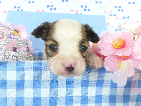 ※体重などの情報は後日掲載いたします。 3/21現在の体重は0.74kgです。 子犬と親犬はブリーダー歴30数年、40数年の経験者と動物看護士などが中心に365日、注意深く、丁寧に観察してお世話をしております。 子犬ちゃんは人間同様、個人差がありますので、子犬ちゃんのお世話の仕方、お食事あげ方はご見学時、お迎え時などに担当のスタッフより詳しくお伝えいたしますのでなんでもご遠慮なくご相談ください。 JKCの全犬種審査員資格者と単犬種パピヨン審査員資格者が在舎しておりますので、パピヨンのスタンダードを熟知しております。 当犬舎はパピヨン一筋50年を超える日本で一番歴史のあるパピヨン専門犬舎です。 犬舎号と登録は1970.10/19です。 日本中の国産のパピヨンで当犬舎の血統が入っていない犬は存在しません。 血統書発行団体JKCより下記表彰を受けております。 JKC特別繁殖奨励賞第1位受賞 犬舎 JKCパピヨン犬種表彰受賞 犬舎 ご見学は大歓迎ですのでどうぞご連絡の上、おいでください。365日年中無休です。 2013年9月1日より「動物の愛護と管理に関する法律」の改正によって、「生体販売時の現物確認・対面販売」が義務規定となりましたので、最低一度は直接犬舎までご来舎いただかなくてはなりません。従いまして今までのようにネットで写真、動画をご覧になっただけではご購入ができなくなりました。これはすべてのブリーダー・ペットショップも例外がありませんので、ご理解、ご協力のほど御願い申し上げます。 手続きに時間がかるため海外への輸出はいたしません。 スタッフの取得資格 (社)JKC 全犬種審査員2名(社)JKC 単犬種パピヨン審査員1名 (国) 動物看護師統一認定機構 愛玩動物看護師国家資格取得(社)JKC スチュアート1名(社)JKC A級ハンドラー1名 (社)JKC C級ハンドラー1名(社)日本愛玩動物協会 愛玩動物飼養管理士2級3名 動物の愛護及び管理に関する法律による動物取扱責任者2名