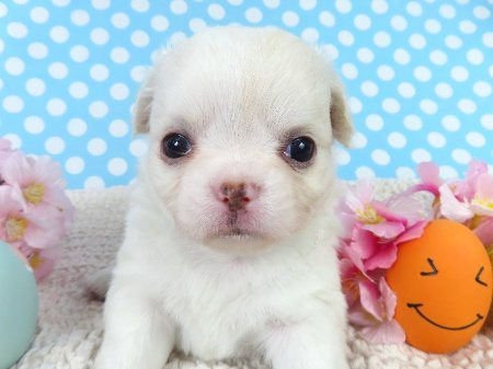 ※体重などの情報は後日掲載いたします。 4/7現在の体重は0.605kgです。 子犬と親犬はブリーダー歴30数年、40数年の経験者と動物看護士などが中心に365日、注意深く、丁寧に観察してお世話をしております。 子犬ちゃんは人間同様、個人差がありますので、子犬ちゃんのお世話の仕方、お食事あげ方はご見学時、お迎え時などに担当のスタッフより詳しくお伝えいたしますのでなんでもご遠慮なくご相談ください。 JKCの全犬種審査員資格者と単犬種パピヨン審査員資格者が在舎しておりますので、パピヨンのスタンダードを熟知しております。 当犬舎はパピヨン一筋50年を超える日本で一番歴史のあるパピヨン専門犬舎です。 犬舎号と登録は1970.10/19です。 日本中の国産のパピヨンで当犬舎の血統が入っていない犬は存在しません。 血統書発行団体JKCより下記表彰を受けております。 JKC特別繁殖奨励賞第1位受賞 犬舎 JKCパピヨン犬種表彰受賞 犬舎 ご見学は大歓迎ですのでどうぞご連絡の上、おいでください。365日年中無休です。 2013年9月1日より「動物の愛護と管理に関する法律」の改正によって、「生体販売時の現物確認・対面販売」が義務規定となりましたので、最低一度は直接犬舎までご来舎いただかなくてはなりません。従いまして今までのようにネットで写真、動画をご覧になっただけではご購入ができなくなりました。これはすべてのブリーダー・ペットショップも例外がありませんので、ご理解、ご協力のほど御願い申し上げます。 手続きに時間がかるため海外への輸出はいたしません。 スタッフの取得資格 (社)JKC 全犬種審査員2名(社)JKC 単犬種パピヨン審査員1名 (国) 動物看護師統一認定機構 愛玩動物看護師国家資格取得(社)JKC スチュアート1名(社)JKC A級ハンドラー1名 (社)JKC C級ハンドラー1名(社)日本愛玩動物協会 愛玩動物飼養管理士2級3名 動物の愛護及び管理に関する法律による動物取扱責任者2名