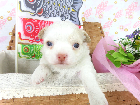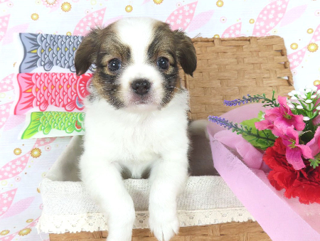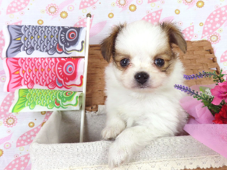 ※体重などの情報は後日掲載いたします。 4/25現在の体重は0.705kgです。 子犬と親犬はブリーダー歴30数年、40数年の経験者と動物看護士などが中心に365日、注意深く、丁寧に観察してお世話をしております。 子犬ちゃんは人間同様、個人差がありますので、子犬ちゃんのお世話の仕方、お食事あげ方はご見学時、お迎え時などに担当のスタッフより詳しくお伝えいたしますのでなんでもご遠慮なくご相談ください。 JKCの全犬種審査員資格者と単犬種パピヨン審査員資格者が在舎しておりますので、パピヨンのスタンダードを熟知しております。 当犬舎はパピヨン一筋50年を超える日本で一番歴史のあるパピヨン専門犬舎です。 犬舎号と登録は1970.10/19です。 日本中の国産のパピヨンで当犬舎の血統が入っていない犬は存在しません。 血統書発行団体JKCより下記表彰を受けております。 JKC特別繁殖奨励賞第1位受賞 犬舎 JKCパピヨン犬種表彰受賞 犬舎 ご見学は大歓迎ですのでどうぞご連絡の上、おいでください。365日年中無休です。 2013年9月1日より「動物の愛護と管理に関する法律」の改正によって、「生体販売時の現物確認・対面販売」が義務規定となりましたので、最低一度は直接犬舎までご来舎いただかなくてはなりません。従いまして今までのようにネットで写真、動画をご覧になっただけではご購入ができなくなりました。これはすべてのブリーダー・ペットショップも例外がありませんので、ご理解、ご協力のほど御願い申し上げます。 手続きに時間がかるため海外への輸出はいたしません。 スタッフの取得資格 (社)JKC 全犬種審査員2名(社)JKC 単犬種パピヨン審査員1名 (国) 動物看護師統一認定機構 愛玩動物看護師国家資格取得(社)JKC スチュアート1名(社)JKC A級ハンドラー1名 (社)JKC C級ハンドラー1名(社)日本愛玩動物協会 愛玩動物飼養管理士2級3名 動物の愛護及び管理に関する法律による動物取扱責任者2名