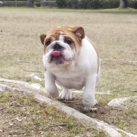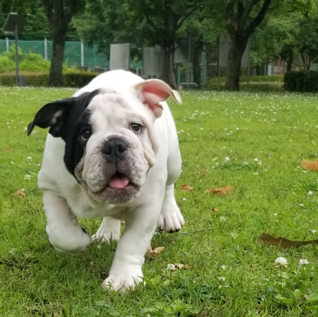 ブルドッグはイギリス原産で、19世紀頃まで牛と戦わせる「ブル・ベイティング」という競技に使われていた犬がルーツです。名前の由来も「ブル(牛)」に由来します。その後この競技が禁止され、闘争性は抑えられ、現在の穏やかな家庭犬へと改良が進みました。