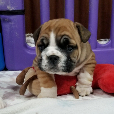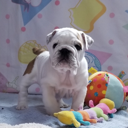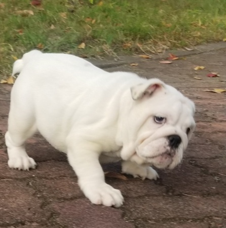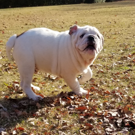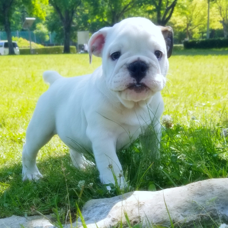 成犬のブルドッグは体高約30〜36cm、体重は約22〜25kg前後が目安です。体高は低めで横幅があり、筋肉質な体型が特徴です。毛色はレッド、ブリンドル、ホワイト、フォーン、パイドなどが代表的で、単色から模様入りまで幅広くみられます。