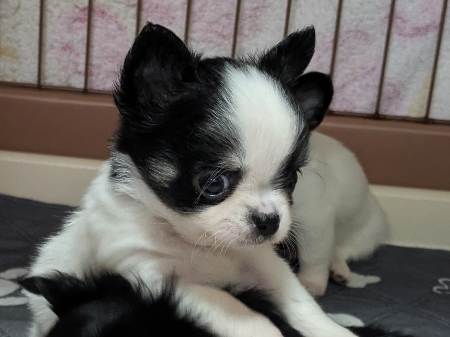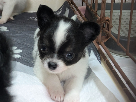 白が多く目から耳まわり、身体に模様的に黒が出る子、黒が多くポイント的に白が出る子もいて様々です。子犬時から成犬時まで色の変化があまりありません。