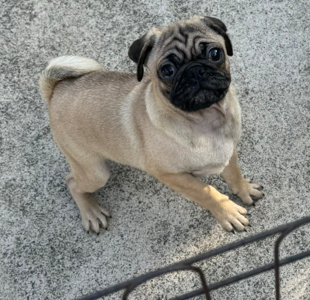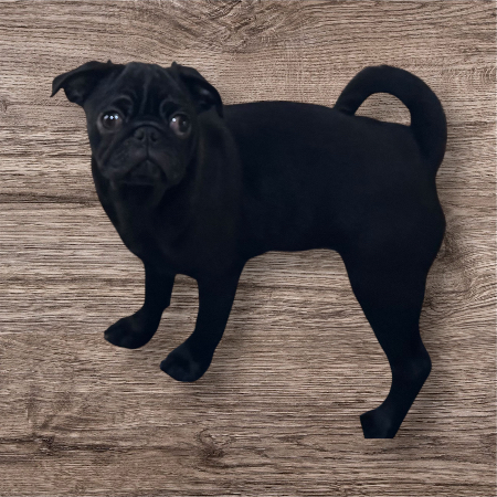 パグは短毛で光沢のある被毛を持ち、体はコンパクトで筋肉質です。顔のしわや大きな丸い目、ぐるりと巻いた尾がトレードマークです。短頭種のため鼻腔が狭く呼吸がしにくくなることがあり、暑さや運動のさせ方に配慮が必要です。