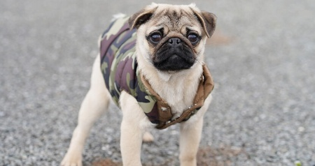 パグは短毛で光沢のある被毛を持ち、体はコンパクトで筋肉質です。顔のしわや大きな丸い目、ぐるりと巻いた尾がトレードマークです。短頭種のため鼻腔が狭く呼吸がしにくくなることがあり、暑さや運動のさせ方に配慮が必要です。